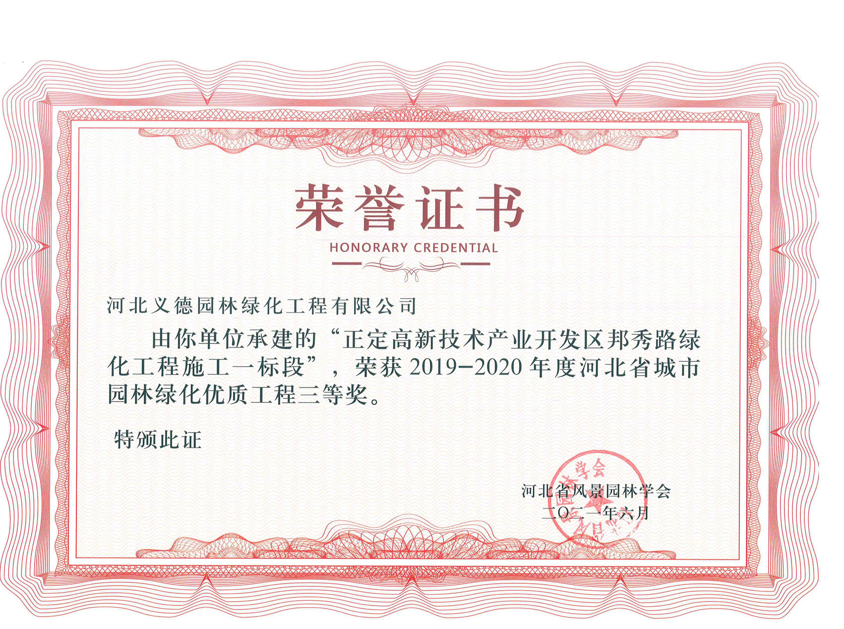 工程業績榮獲有2017-2018年度河北省城市園林綠化優質工程二等獎兩個;2019-2020年度河北省城市園林綠化優質工程二等獎兩個、三等獎兩個;2018至2020年保定市燕趙杯優質工程五個;2020年度石家莊市優質工程一個。
